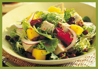 {"ops":[{"insert":"3/4 pound cooked peppered pork roast, cut into 1/2-inch cubes"},{"attributes":{"list":"bullet"},"insert":"\n"},{"insert":"one 15-ounce canned black beans, rinsed and drained"},{"attributes":{"list":"bullet"},"insert":"\n"},{"insert":"2 ripe mangoes, peeled and cubed (or one 26-ounce jar of mango slices, drained)"},{"attributes":{"list":"bullet"},"insert":"\n"},{"insert":"6 cups mixed greens"},{"attributes":{"list":"bullet"},"insert":"\n"},{"insert":"1/4 red onion, halved and then thinly sliced"},{"attributes":{"list":"bullet"},"insert":"\n"},{"insert":"1/2 cup fruit-flavored vinaigrette dressing"},{"attributes":{"list":"bullet"},"insert":"\n"}]}
