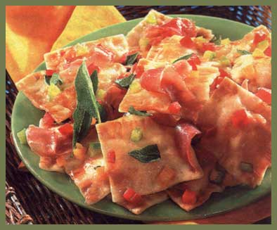 {"ops":[{"insert":"2 shallots, chopped"},{"attributes":{"list":"bullet"},"insert":"\n"},{"insert":"2/3 cup crumbled ricotta salata cheese"},{"attributes":{"list":"bullet"},"insert":"\n"},{"insert":"2/3 reduced-fat ricotta cheese"},{"attributes":{"list":"bullet"},"insert":"\n"},{"insert":"1/2 cup chopped fresh parsley"},{"attributes":{"list":"bullet"},"insert":"\n"},{"insert":"1 tsp freshly grated lemon zest"},{"attributes":{"list":"bullet"},"insert":"\n"},{"insert":"1 tsp cracked black pepper, divided"},{"attributes":{"list":"bullet"},"insert":"\n"},{"insert":"1 large egg, separated"},{"attributes":{"list":"bullet"},"insert":"\n"},{"insert":"34 won-ton wrappers, halved"},{"attributes":{"list":"bullet"},"insert":"\n"},{"insert":"2 tbs olive oil, divided"},{"attributes":{"list":"bullet"},"insert":"\n"},{"insert":"1 tbs butter"},{"attributes":{"list":"bullet"},"insert":"\n"},{"insert":"1/2 each small red, yellow, green bell peppers, chopped"},{"attributes":{"list":"bullet"},"insert":"\n"},{"insert":"2 slices imported prosciutto, sliced"},{"attributes":{"list":"bullet"},"insert":"\n"},{"insert":"2 tbs. fresh chopped sage"},{"attributes":{"list":"bullet"},"insert":"\n"}]}